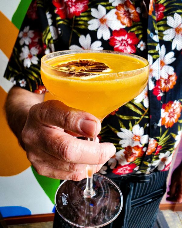 ilegal mezcal, plantation oftd rum, pineapple, lemon, liquid alchemist ginger, angostura, peychaud's